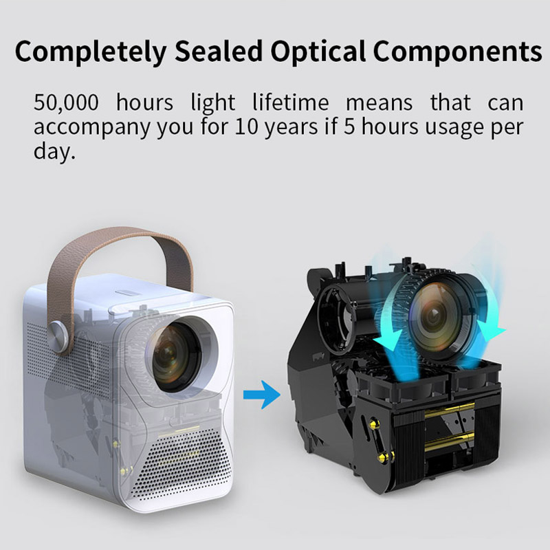 • Resolution 1920x1080p physical resolution • LED projector/built-in battery (optional). •Android 9.0 OS. Pre-installed NETFLIX, YOUTUBE •Support wireless sync display with Android phone /iphone •Support WiFi & Bluetooth function•Support vertical +-40°,Support Horizontal+-40° • Hermetically sealed optical engine engine